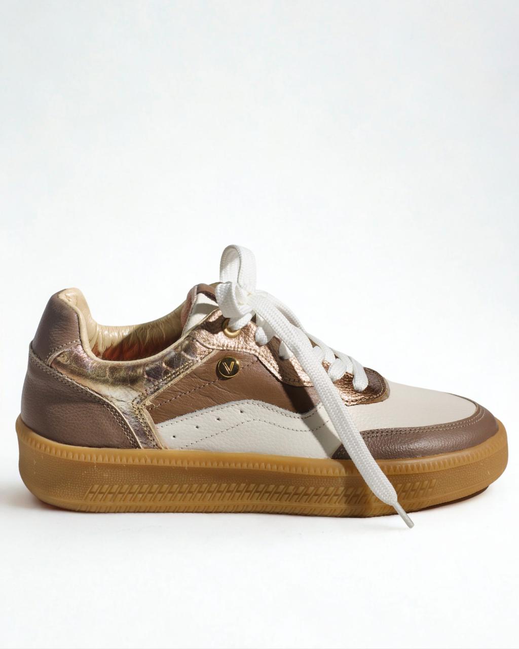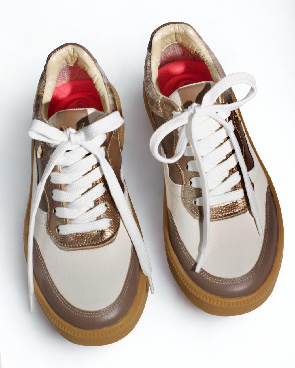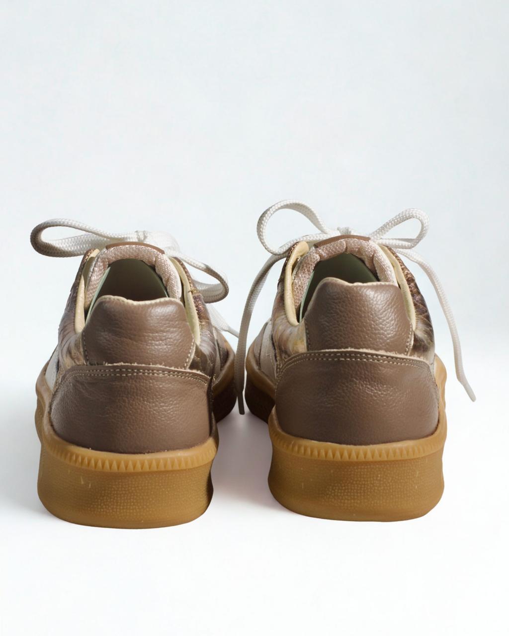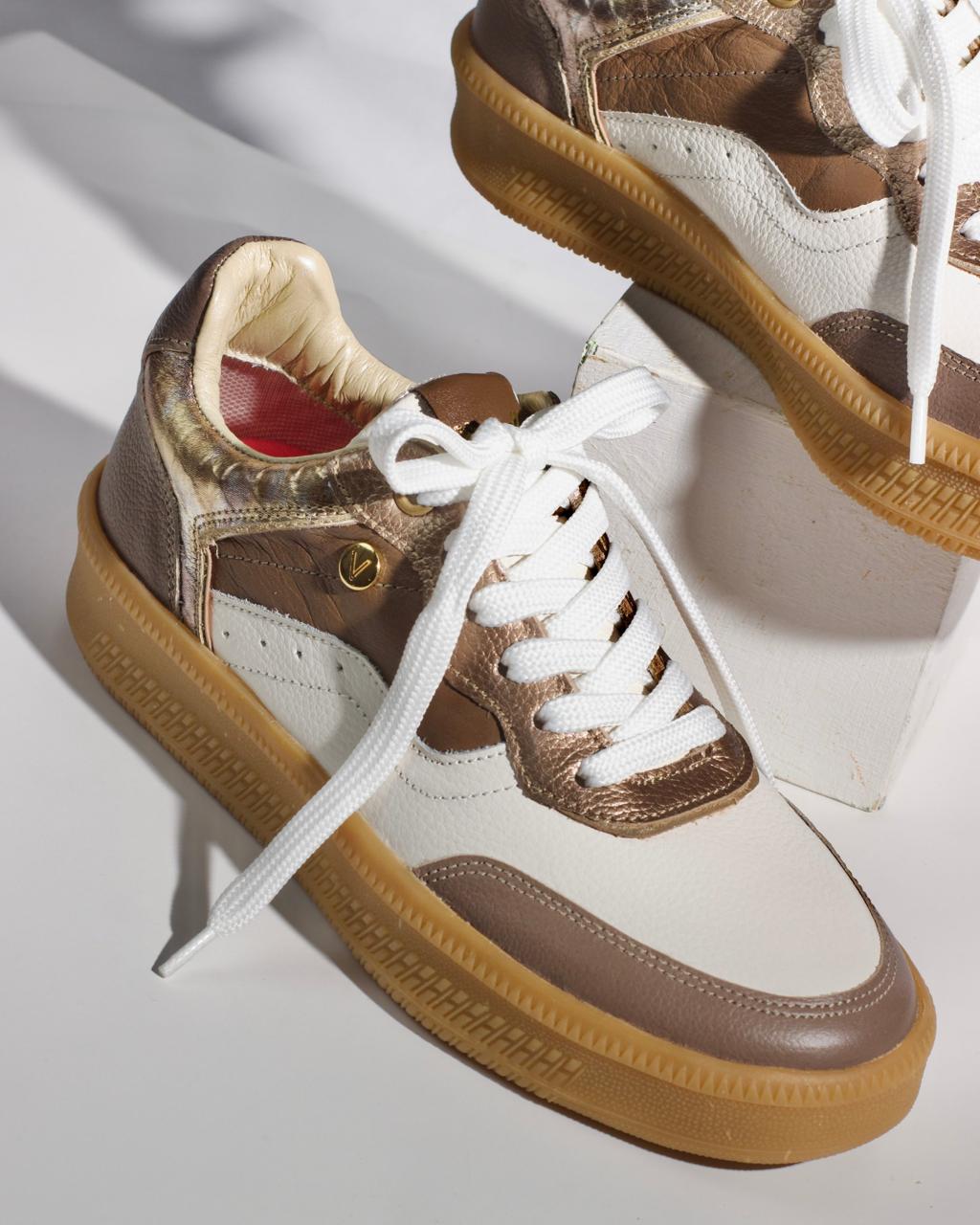Tenis en cuero tono taupe, combinado con tonos tierra y dorado, con suela en caucho, forrados en su interior con espumas de alta densidad y cuellos en badana. Texturas que resaltan y acentúan tú lado femenino.