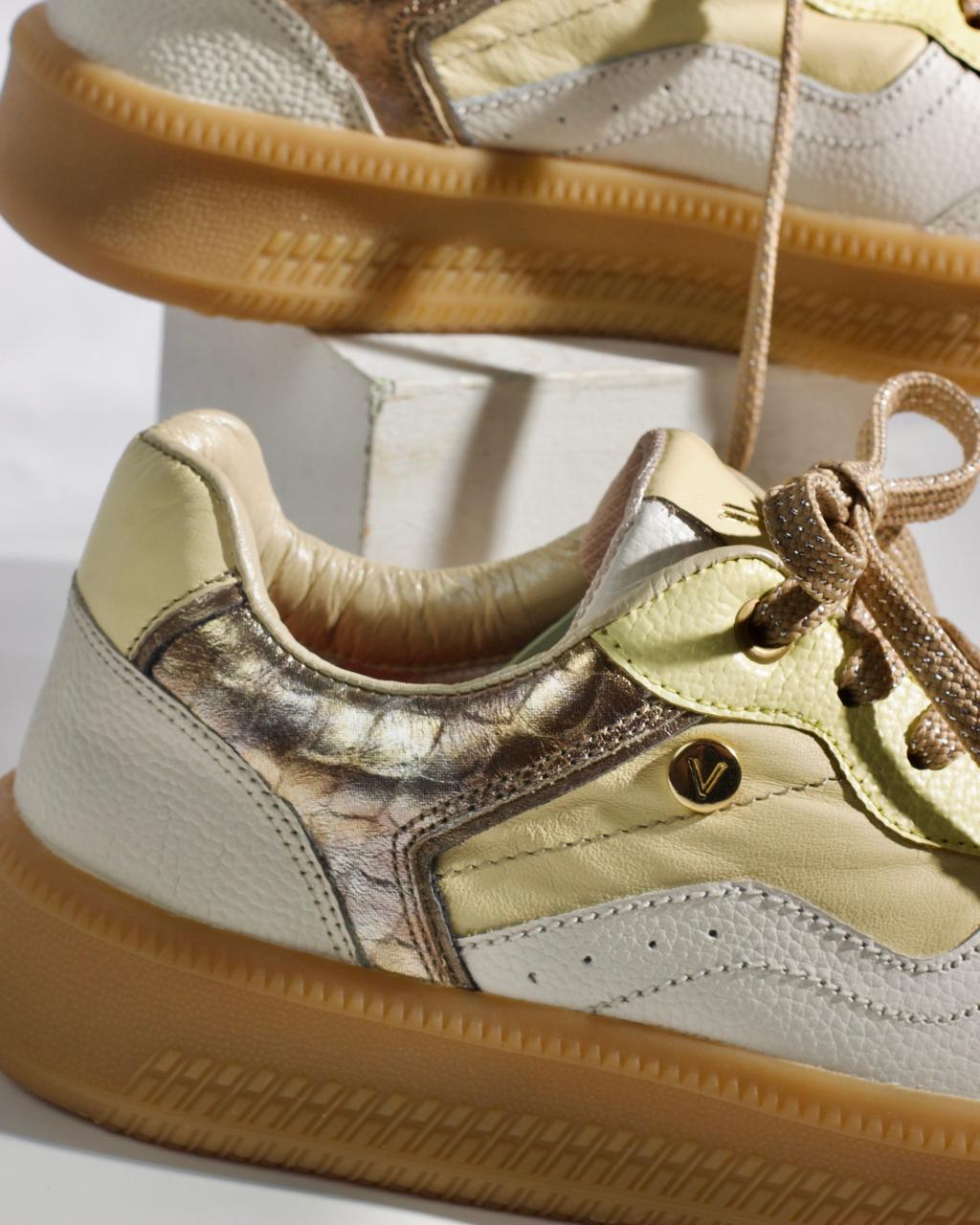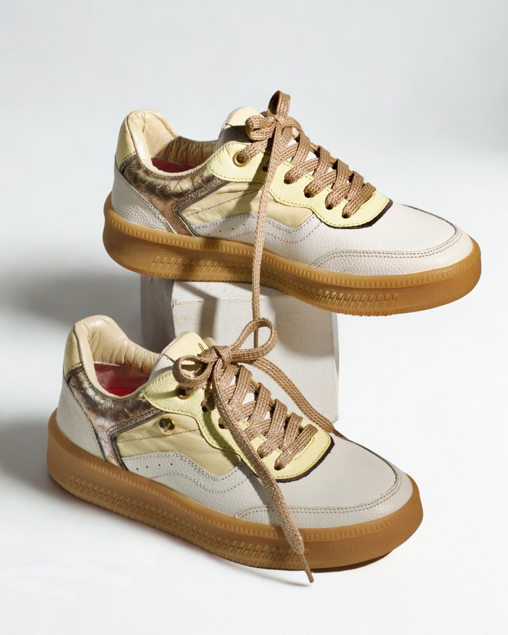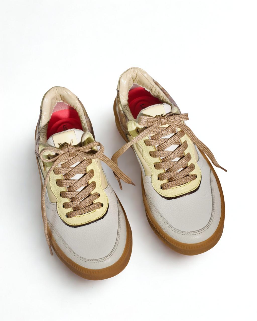 Tenis en cuero blanco, combinado con beige, amarillo y dorado, con suela en caucho, forrados en su interior con espumas de alta densidad y cuellos en badana. Texturas que resaltan y acentúan tú lado femenino.