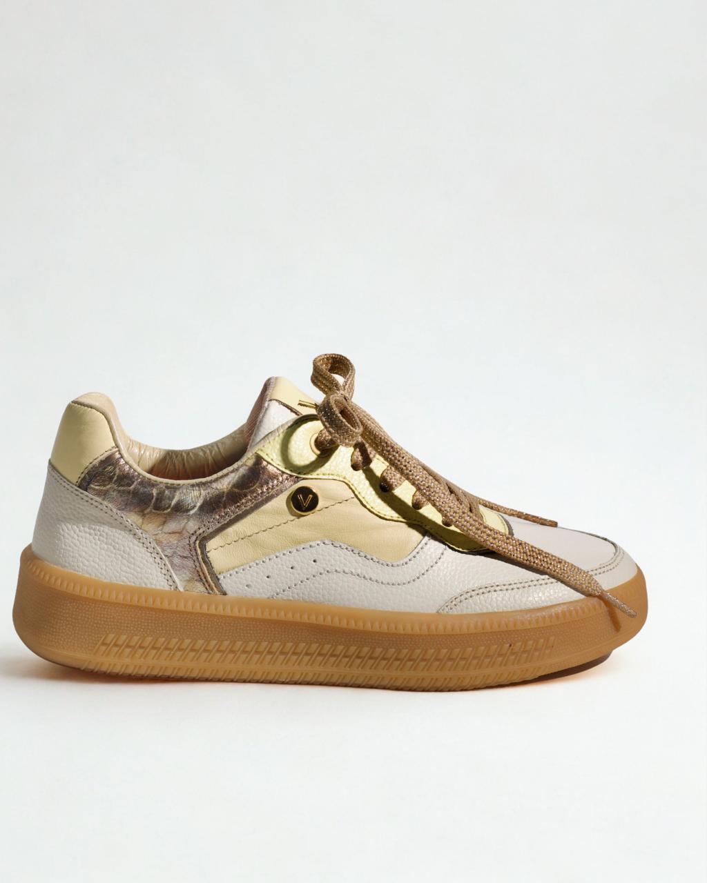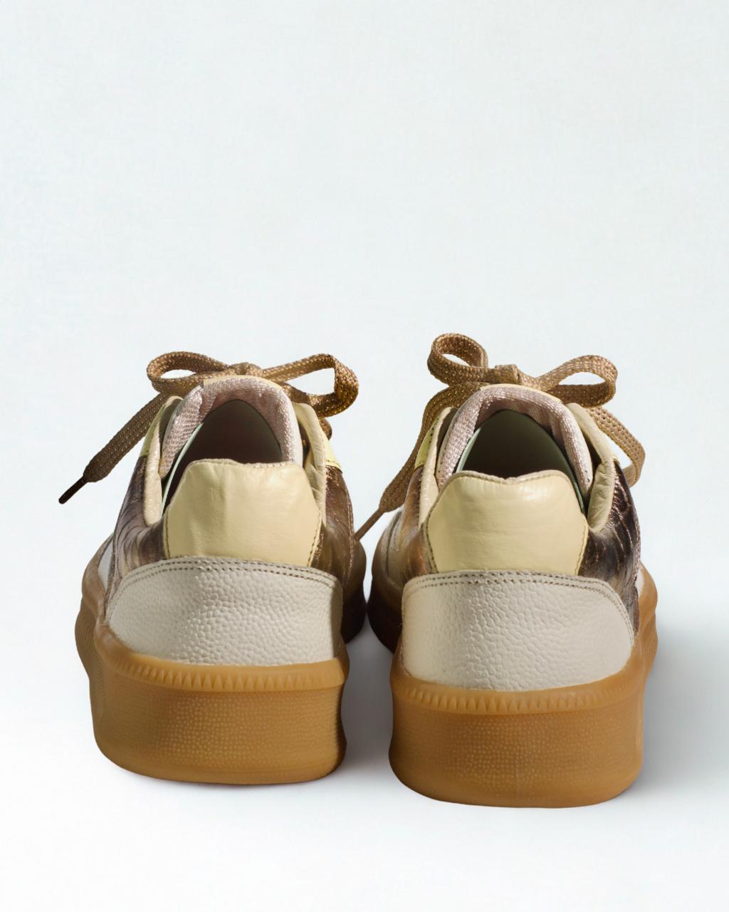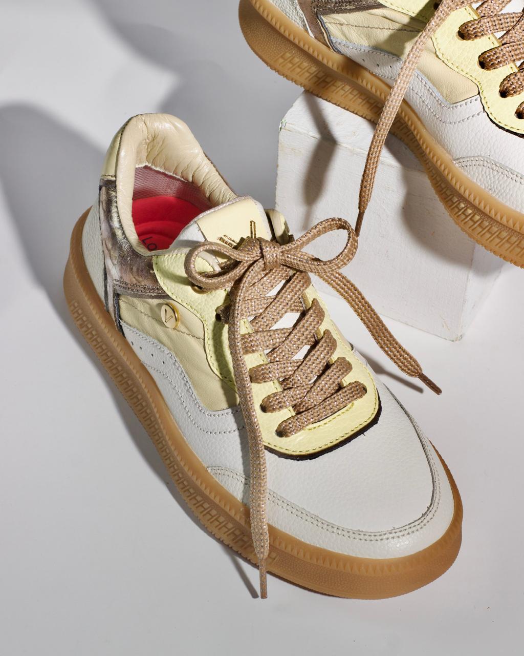 Tenis en cuero blanco, combinado con beige, amarillo y dorado, con suela en caucho, forrados en su interior con espumas de alta densidad y cuellos en badana. Texturas que resaltan y acentúan tú lado femenino.