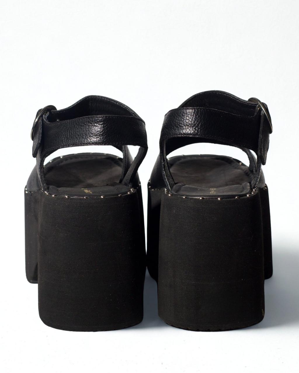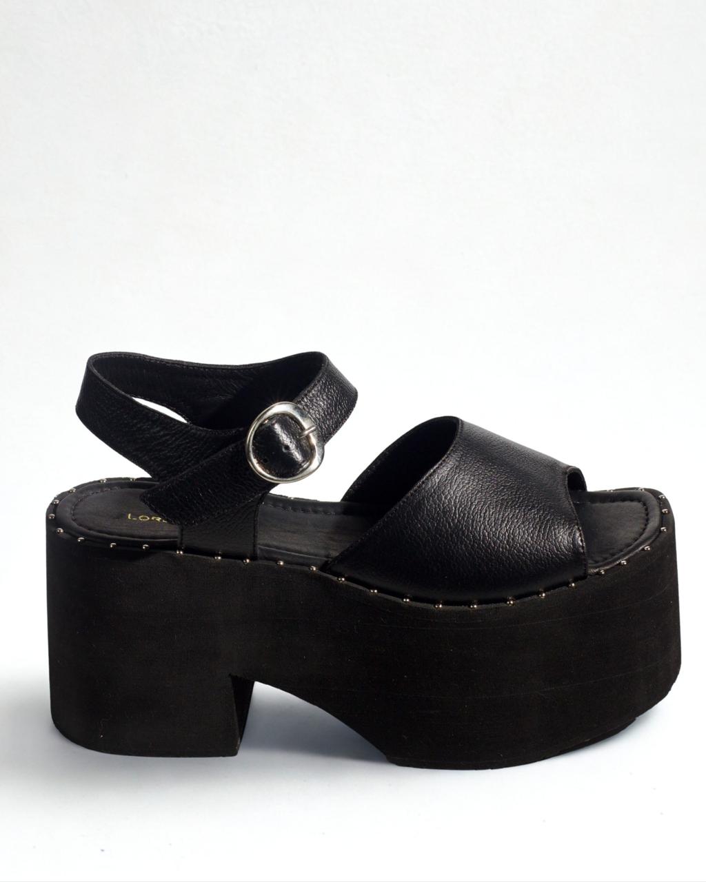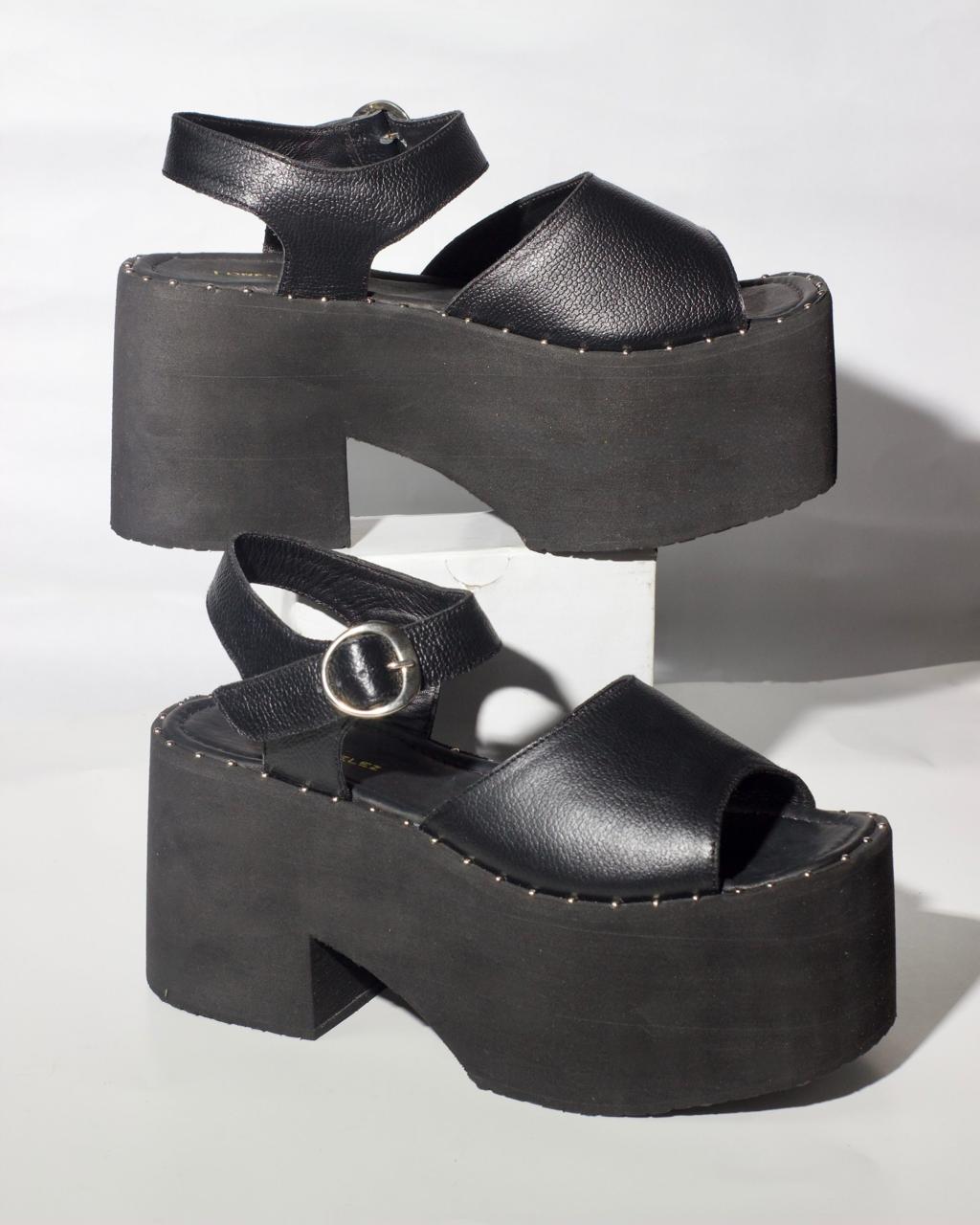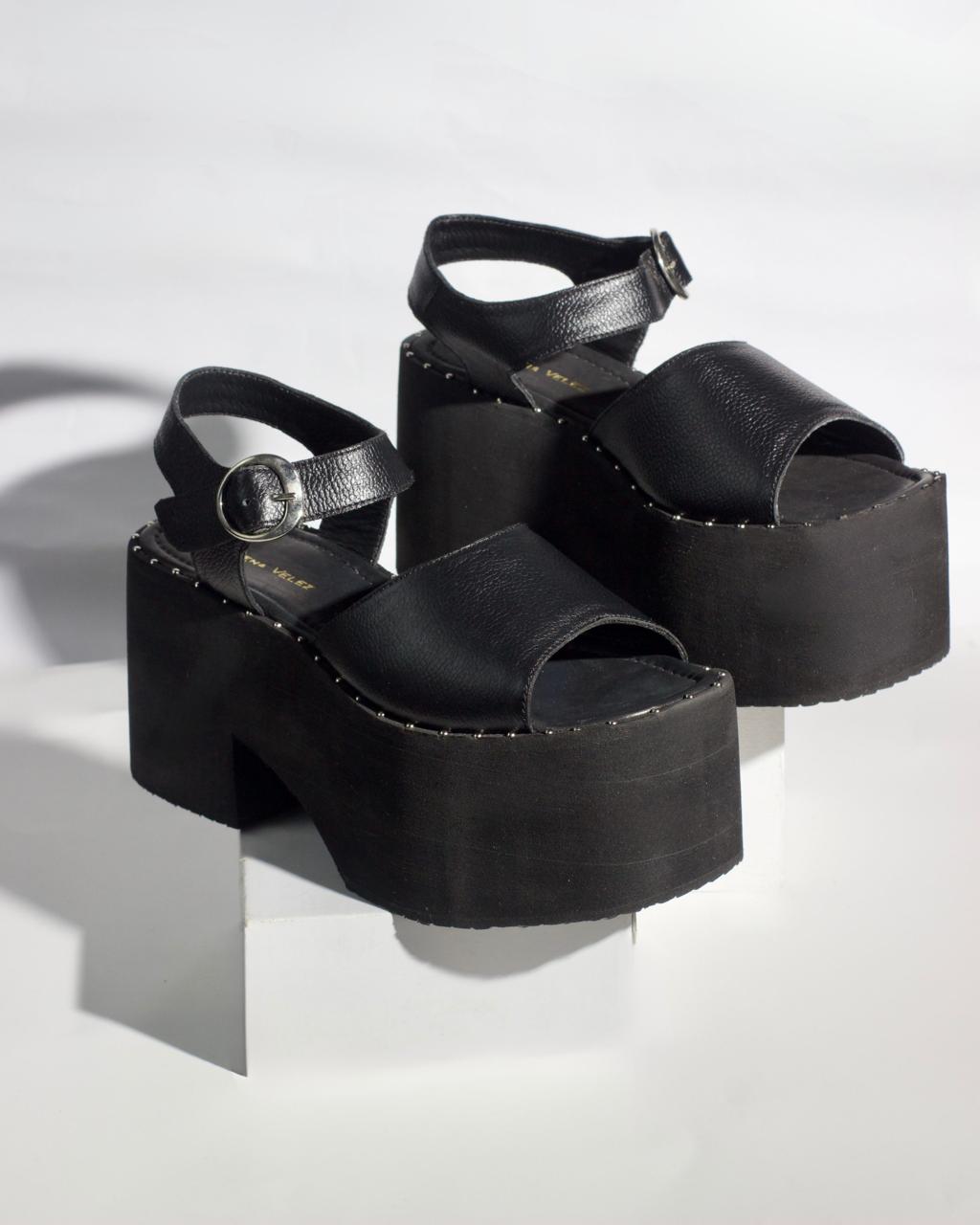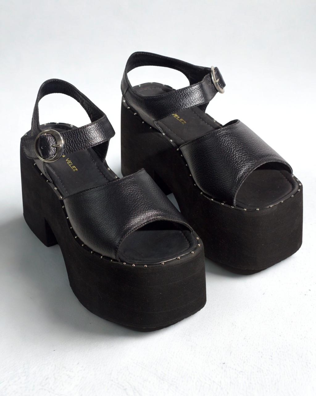 Sandalias de plataforma en cuero tono negro, con un estilo muy atractivo que acentúa tu lado femenino, con finos apliques en el contorno, suela en Eva a tono, con una altura de 9 cms en el talón y 7 cms en la parte delantera. Super cómodas y muy livianas, ideales para largas jornadas.