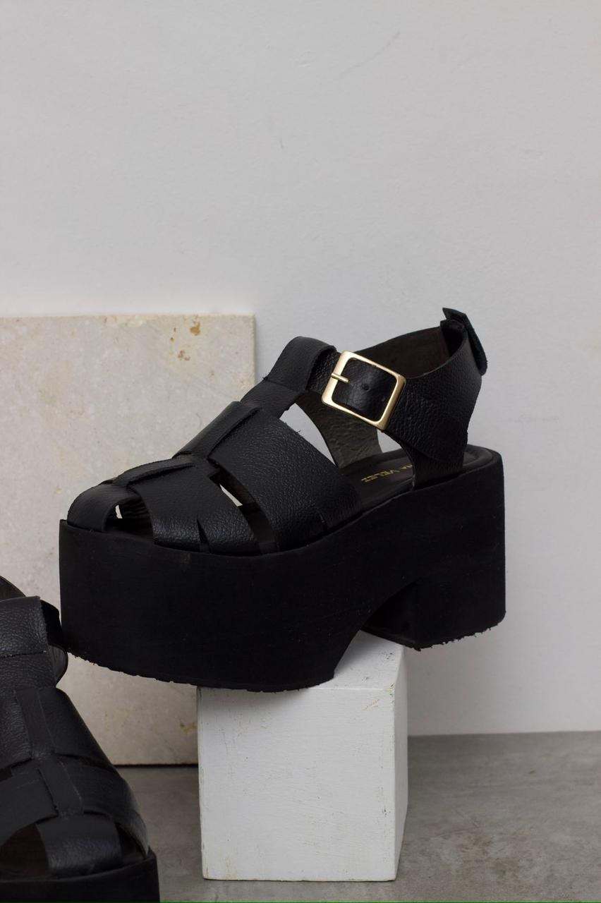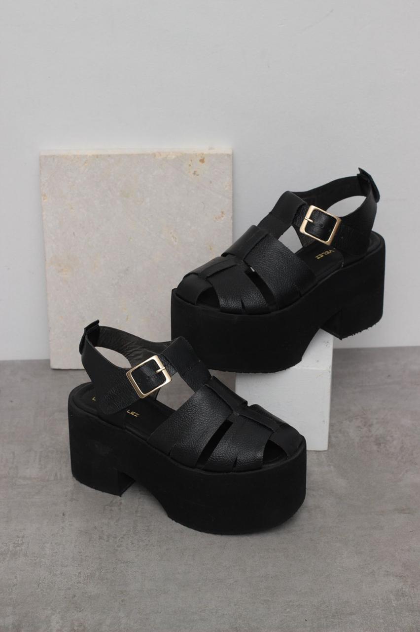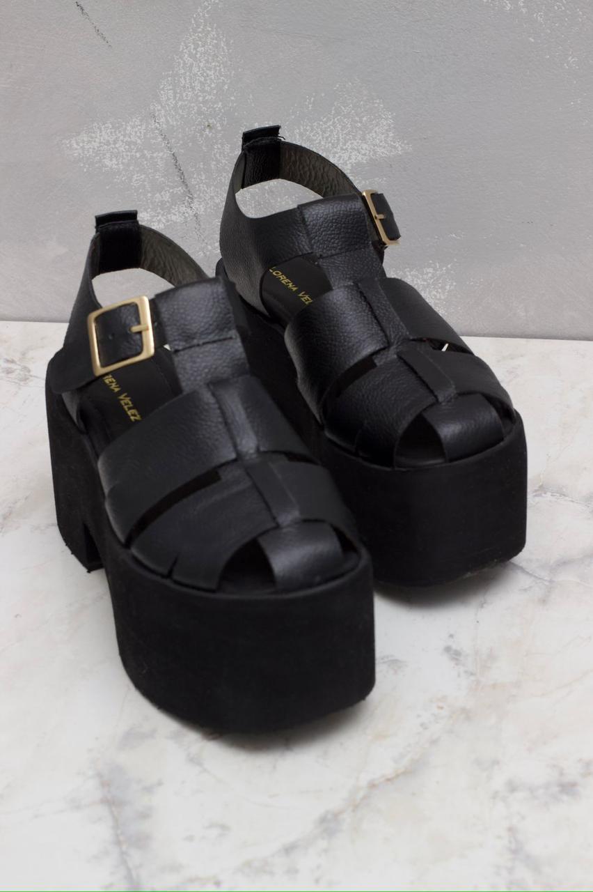Sandalias de plataforma en cuero tono negro, con un estilo muy atractivo que acentúa tu lado femenino, suela en Eva a tono, con una altura de 9 cms en el talón y 7 cms en la parte delantera. Super cómodas y muy livianas, ideales para largas jornadas.