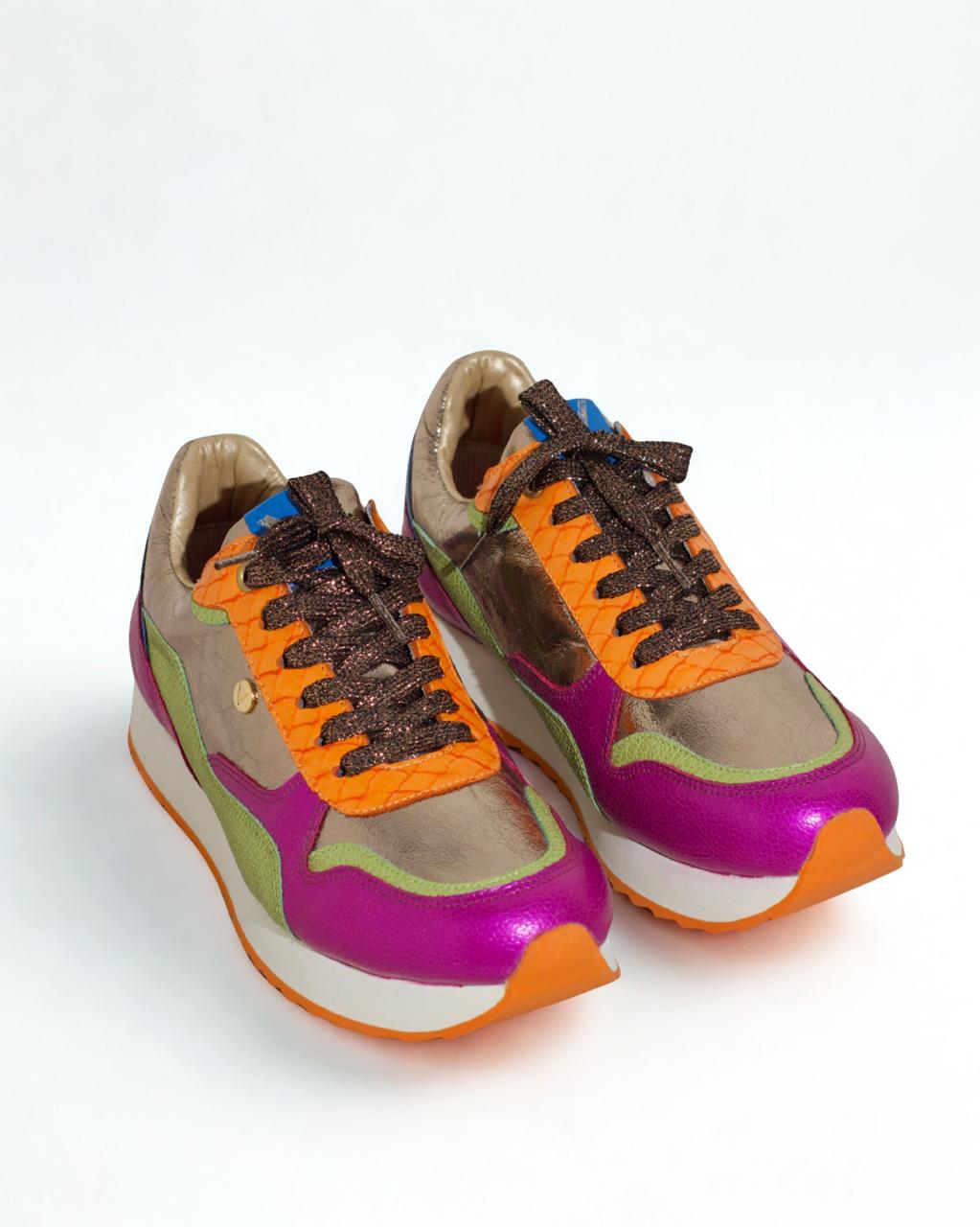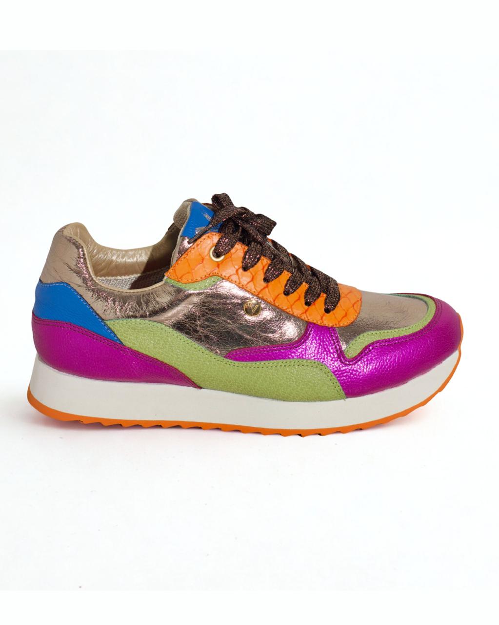 Tenis en cuero multicolor, combinado con detalles en tonos metalizados, con suela fabricada en laminas de eva para mayor confort, altura de 3 cms, forrados en su interior con espumas de alta densidad y cuellos en badana. Texturas que resaltan y acentúan tú lado femenino.