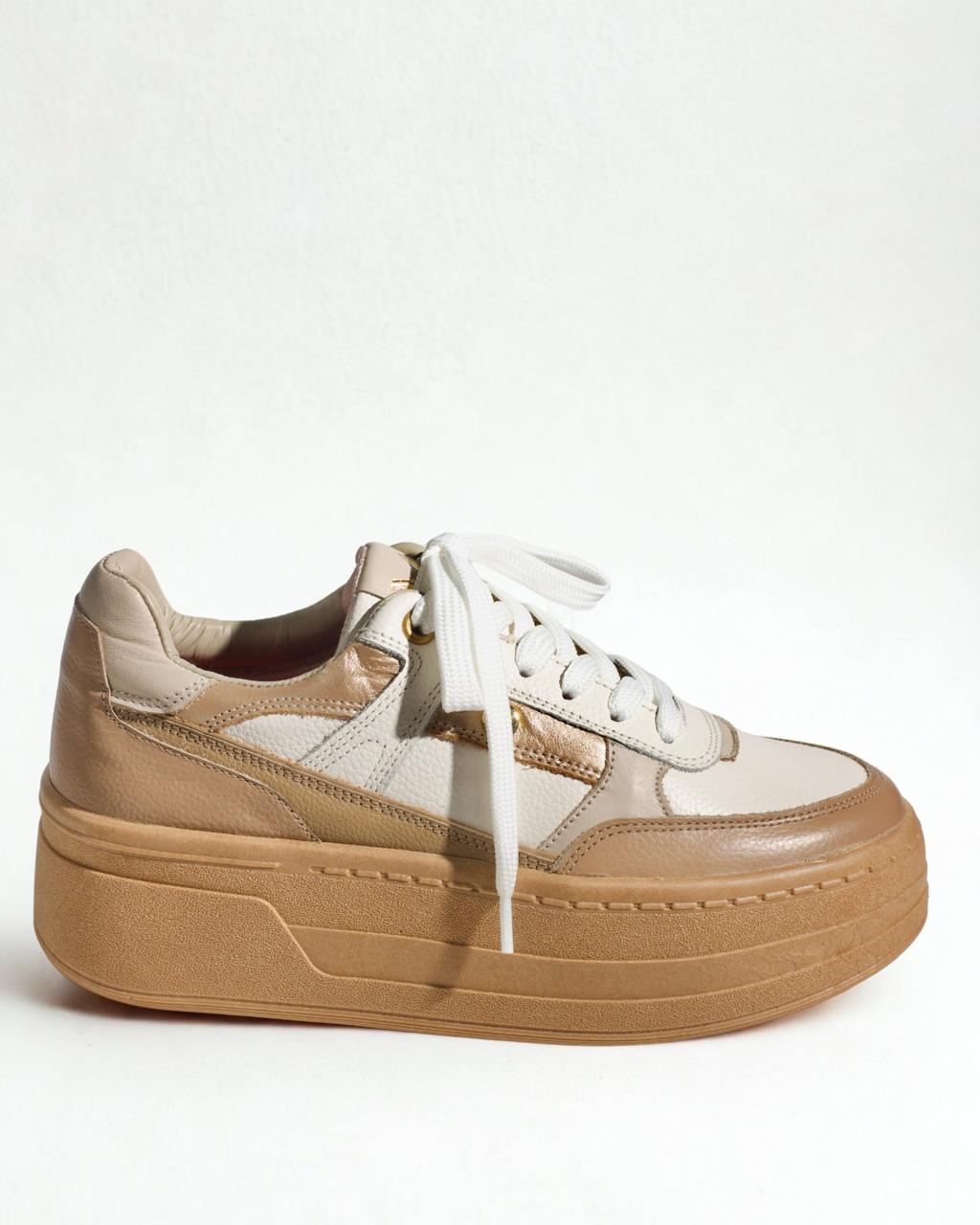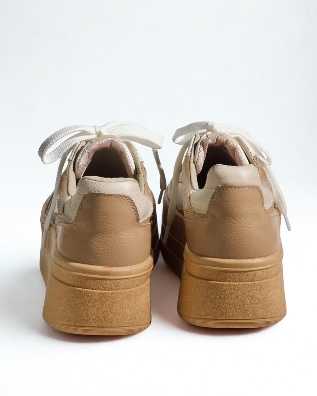 Tenis en cuero tono taupe, combinado con tonos tierra, con suela en caucho de 3 cms, forrados en su interior con espumas de alta densidad y cuellos en badana. Texturas que resaltan y acentúan tú lado femenino.
